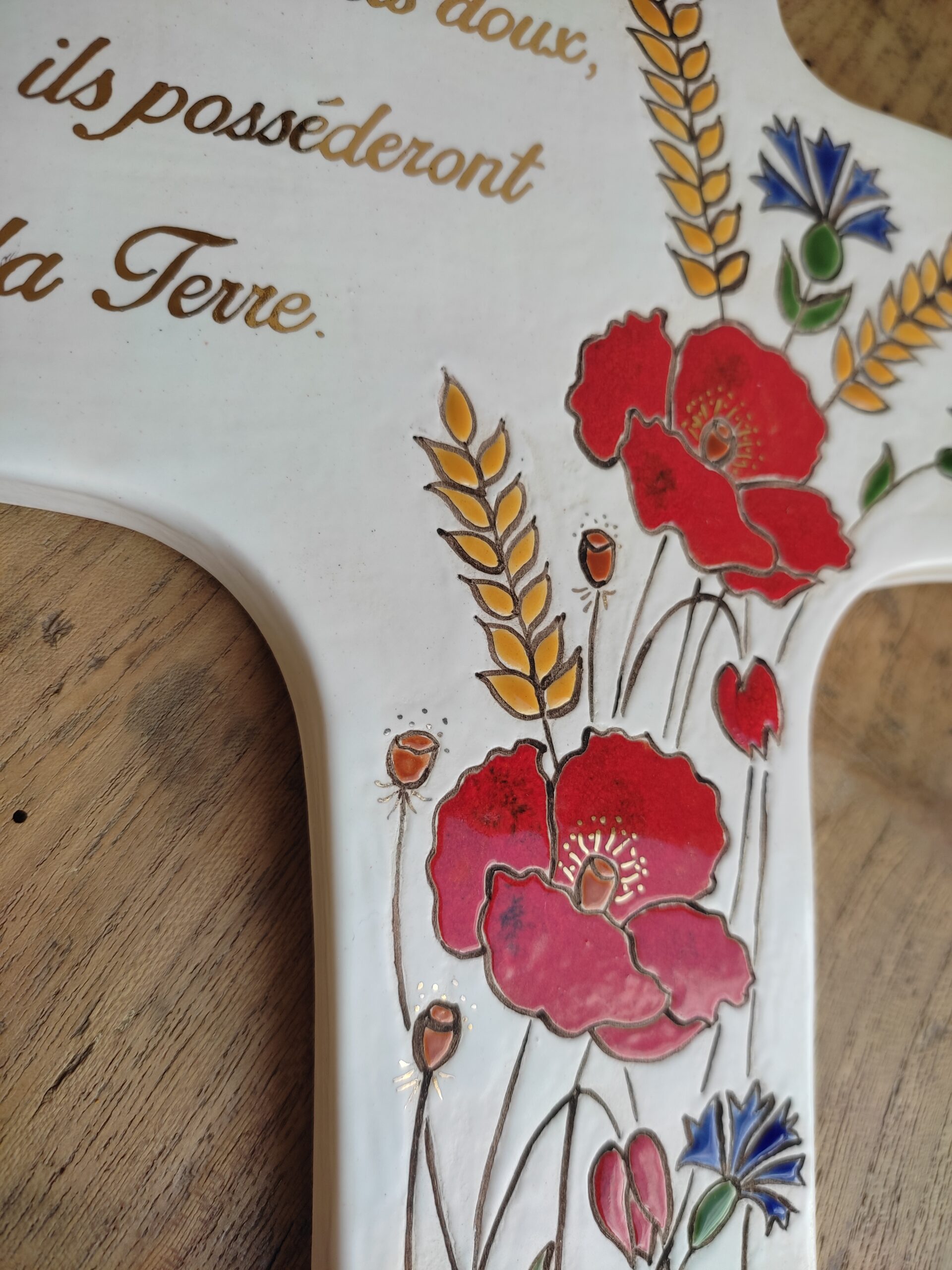 Et parce qu’elle est la première, à vous être proposée, réalisée avec la technique d’émail cloisonné. Cette technique a été travaillée durant le congés maternité n°5. Elle consiste à cerner des alvéoles sur un biscuit de faïence (terre cuite une première fois à 1050°C) et déposer une goutte d’émail coloré à côté d’une autre jusqu’au remplissage total de la forme. Cela donne un relief unique au décor. Le texte est écrit à l’or fin, à main levée. Chaque croix est artisanale et unique.